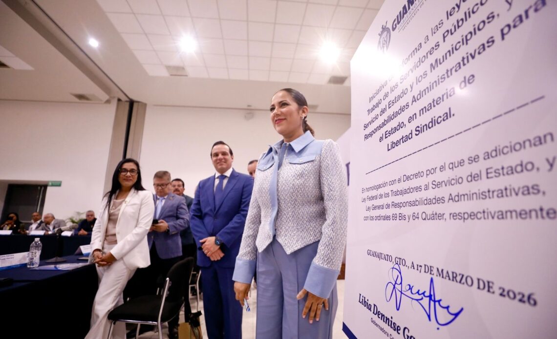 Guanajuato, Gto.- La Gobernadora de la Gente, Libia Dennise García Muñoz Ledo, firmó la iniciativa de reforma que será enviada al Congreso del Estado con el objetivo de garantizar plenamente la libertad sindical y fortalecer la vida democrática en el ámbito laboral, en un hecho respaldado por representantes de sindicatos de los tres órdenes de gobierno.