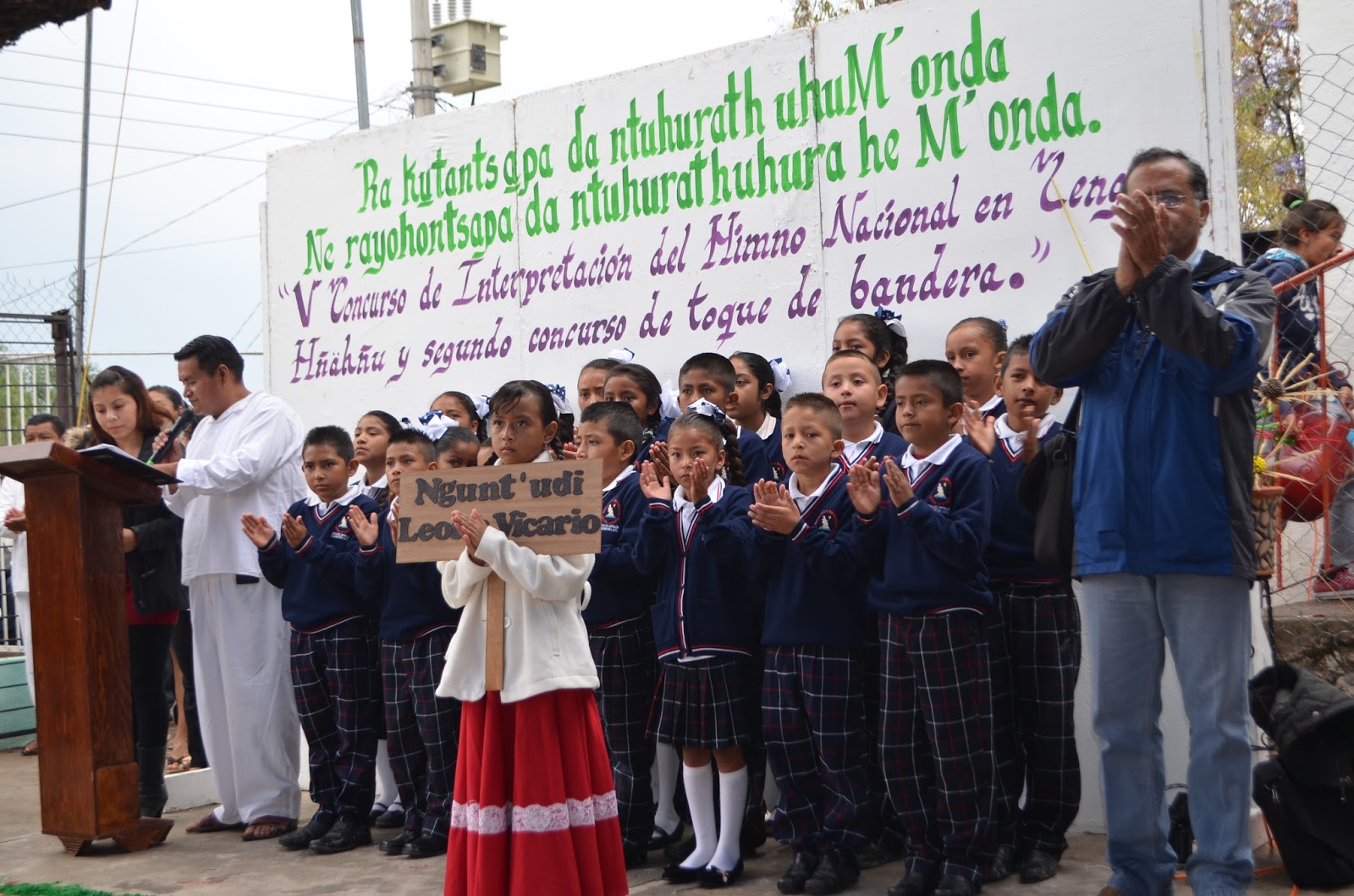 Uno a uno, los coros de las escuelas interpretaron el Himno Nacional Mexicano y el Toque de Bandera en Hñähñú, demostrando su gran sentir y orgullo de sus raíces, mientras que padres de familia presentes, apoyaban desde las gradas a sus hijos, motivándolos con aplausos y felicitaciones.
